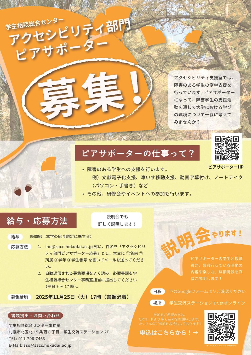 1.inq@sacc.hokudai.ac.jp宛に、件名を「アクセシビリティ部門ピアサポーター応募」とし、